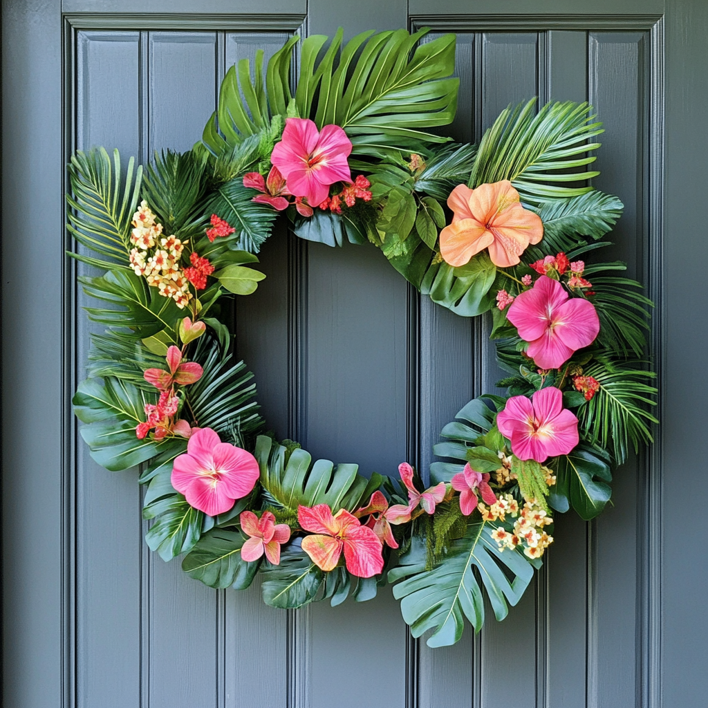If summer had a fashion show, this wreath would be walking the runway in a leaf-print kaftan and oversized sunglasses. It’s bold, it’s bright, and it’s serving serious vacation energy.