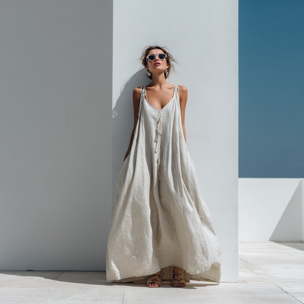 A linen maxi dress already gives that airy, minimalist vibe without needing extra styling.