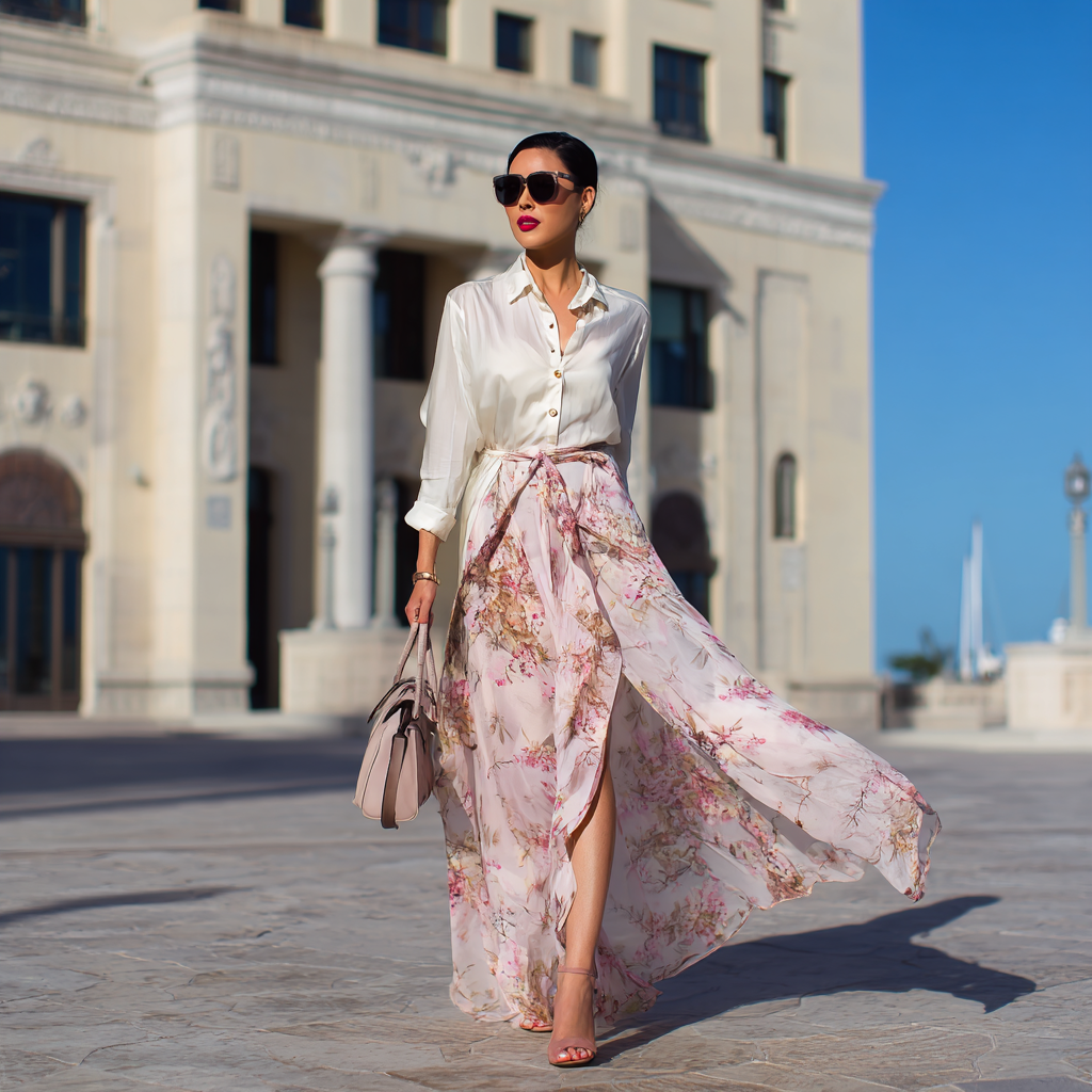 A flowy maxi dress paired with simple flat sandals is clean, minimal, and breathable.