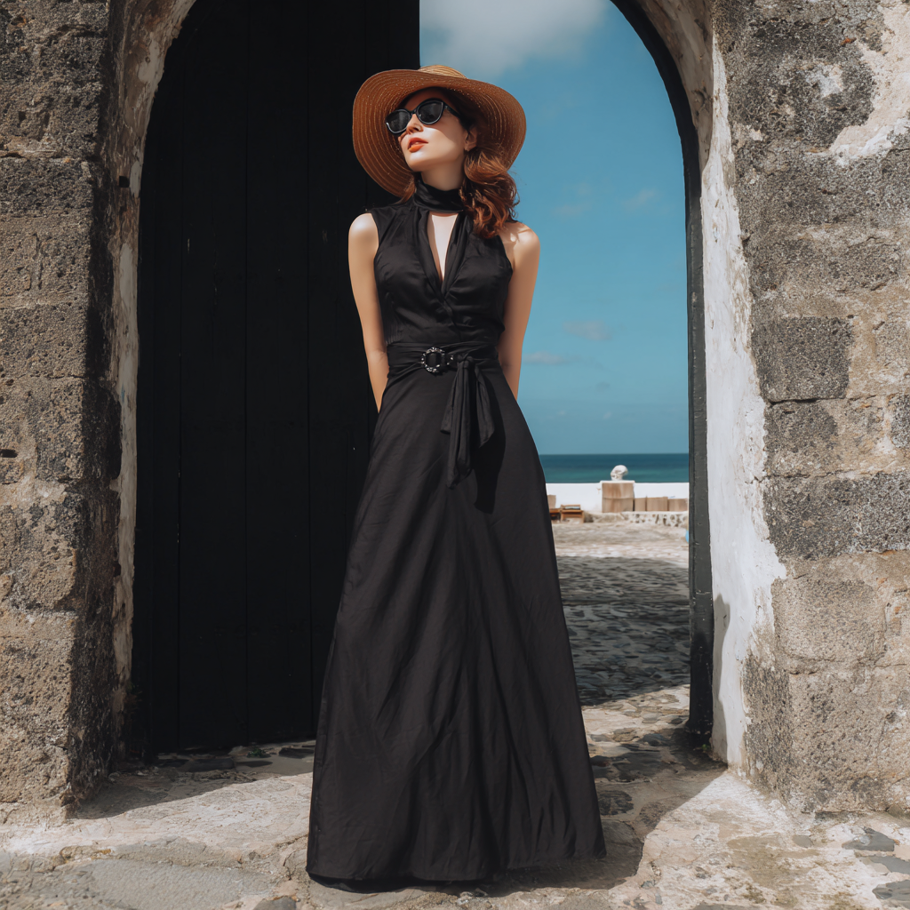 Choose a lightweight black maxi dress in breathable fabric.