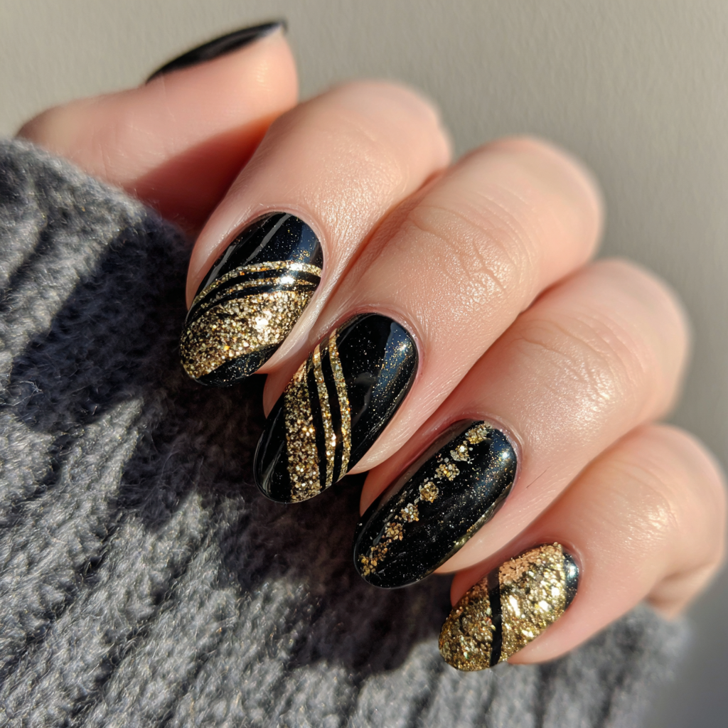 For those who like their Christmas aesthetic a little moodier, black nails with a single gold accent are it. The combo is bold but minimalist, and it looks amazing with literally every holiday outfit.