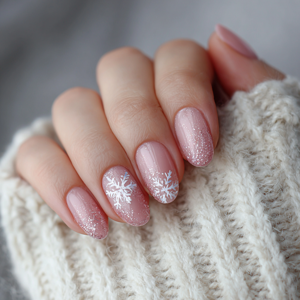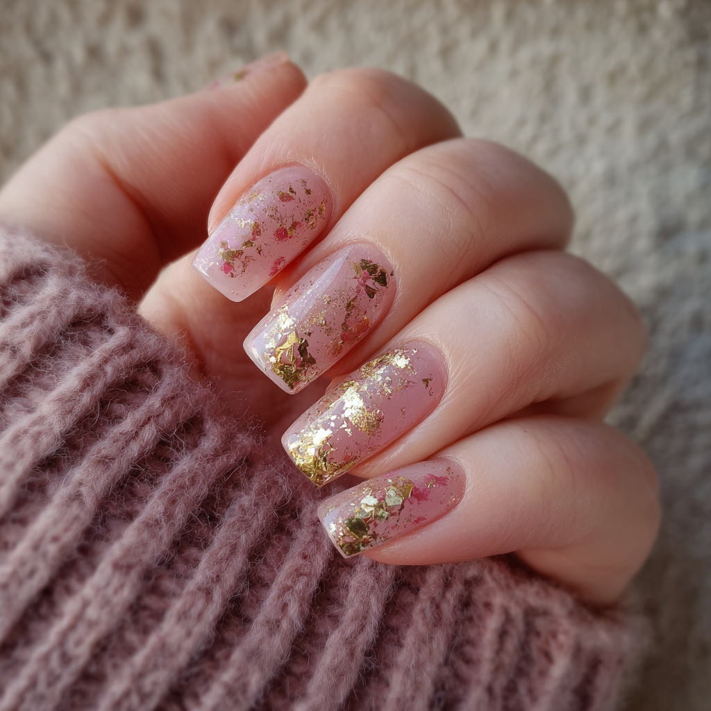If you’re a “soft girl” aesthetic lover, this one’s for you. Blush pink nails with tiny gold foil flakes feel cozy and feminine, but still perfectly festive.
