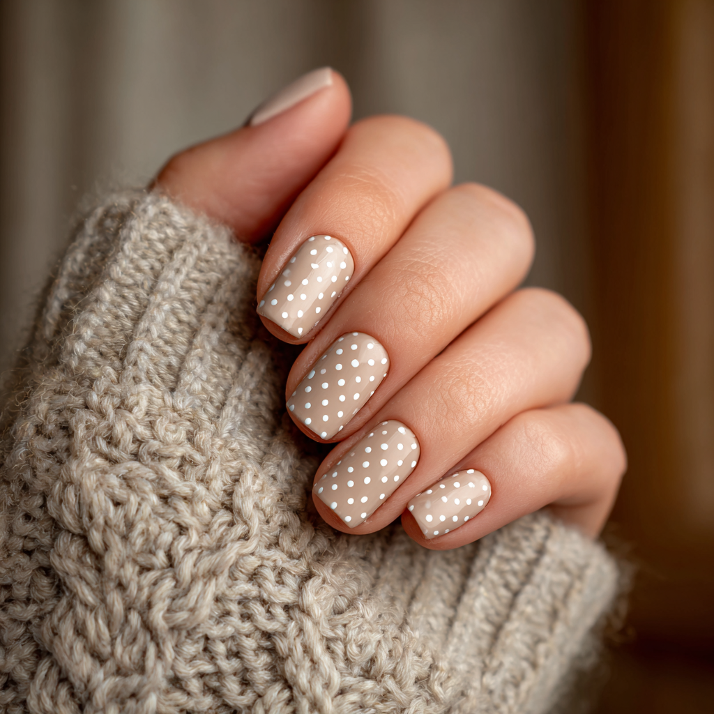 Channel those first snowflakes with a few tiny white dots on beige nails. The look? Effortless winter charm.