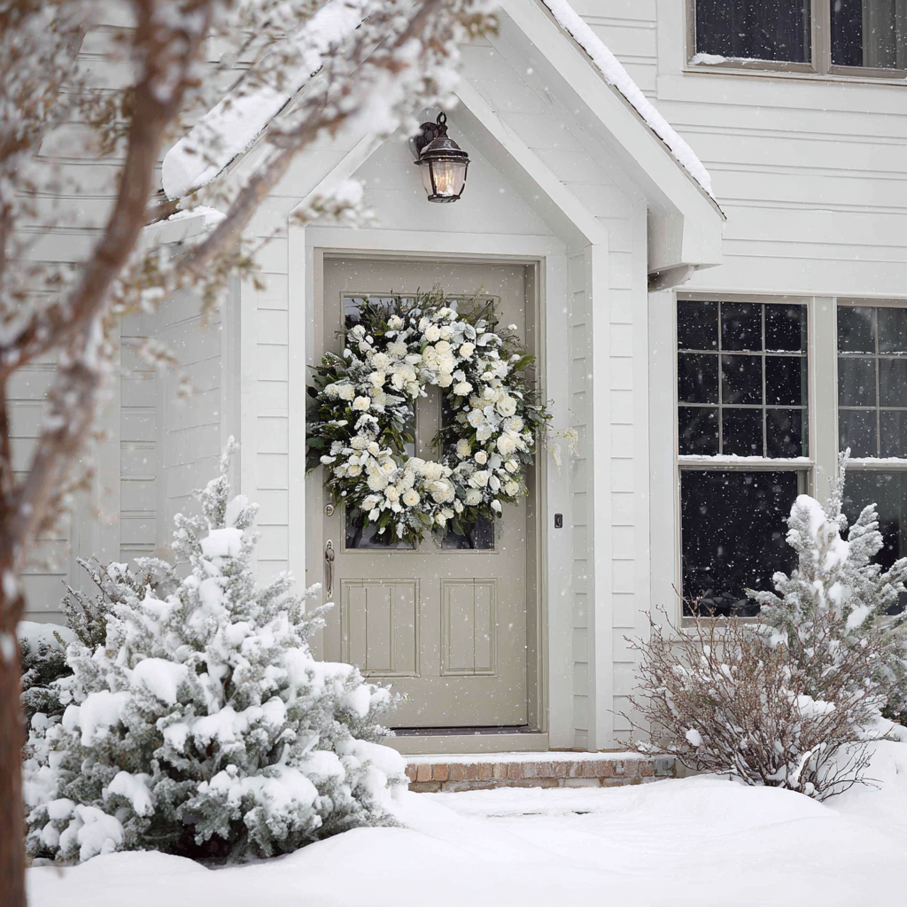 Bring a frosty, elegant vibe to your décor with a white-themed wreath. Use white berries, frosted pinecones, and maybe a hint of faux snow spray on the greenery.
