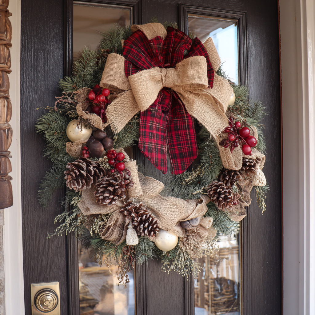 Keep it simple — no ornaments, no glitter — just lush greenery tied with a wide satin or velvet bow. A deep red, forest green, or cream ribbon instantly adds elegance.