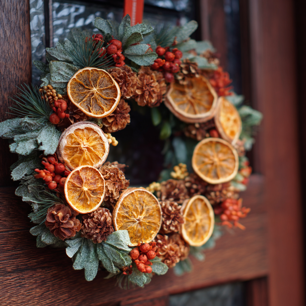 Combine evergreen branches with slices of dried oranges, cinnamon sticks, and star anise. The result? A cozy, rustic wreath that smells like Christmas in the best way.