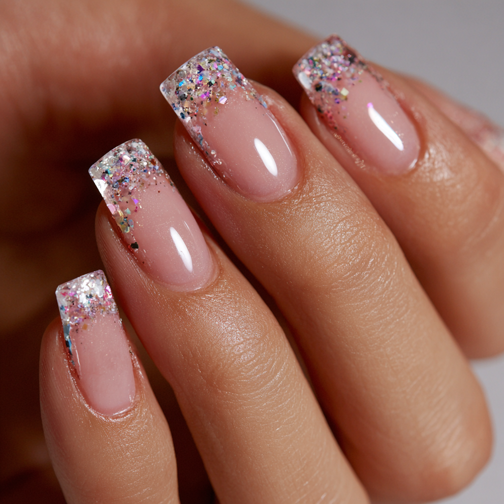 This is the ultimate minimalist approach. Nude nails keep it clean, while a thin glitter tip gives a touch of sparkle.