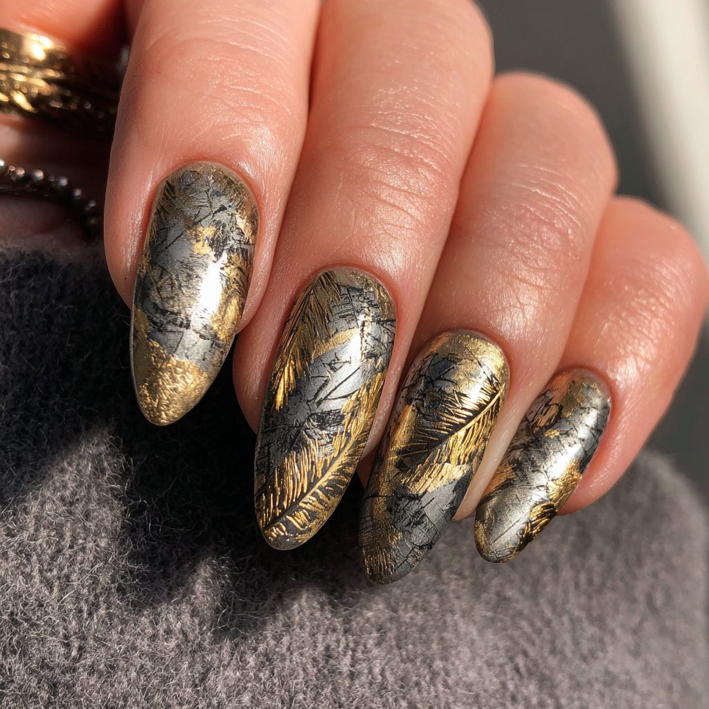 Press tiny pieces of gold foil onto just a couple of nails. It’s artsy, imperfect, and looks amazing in flash photos.