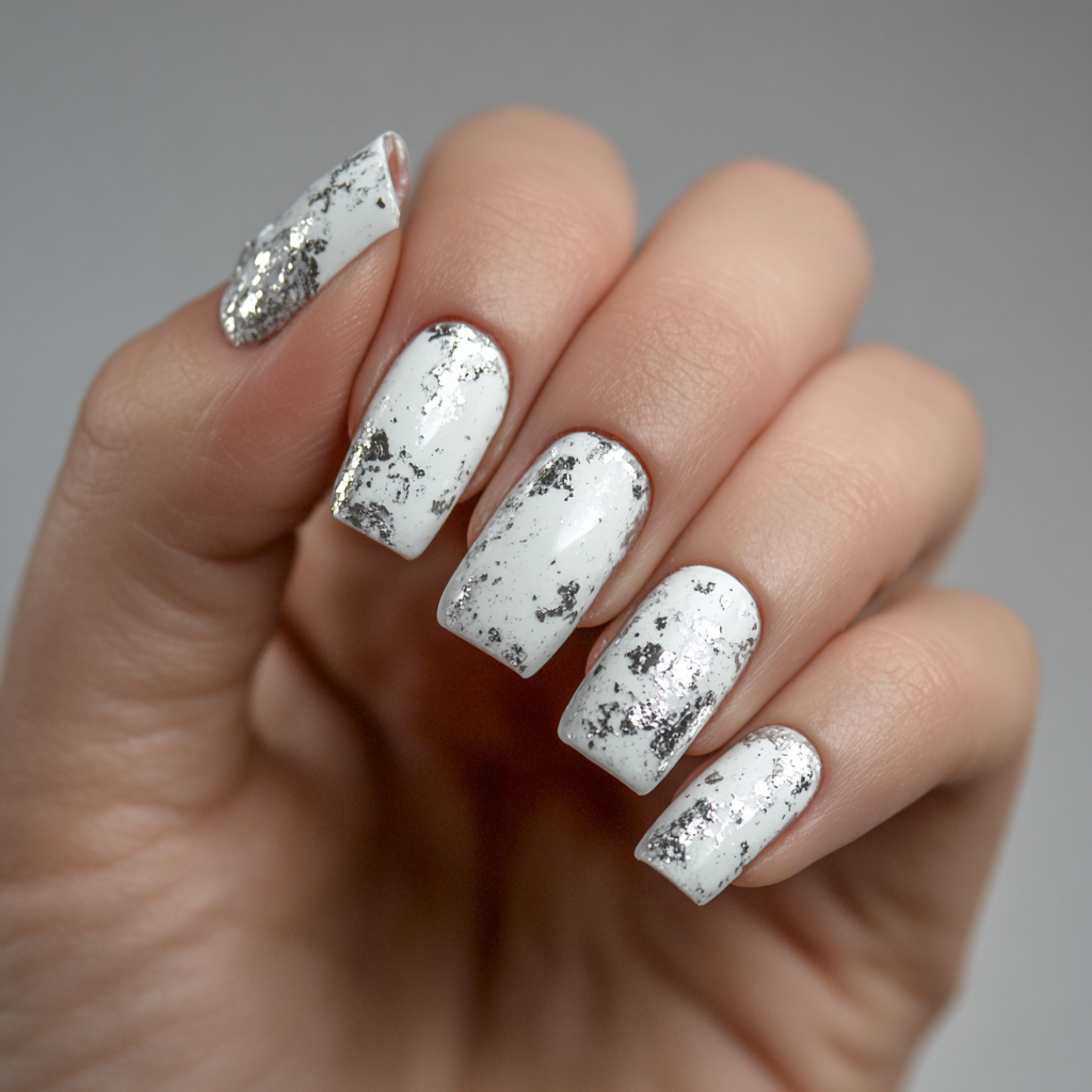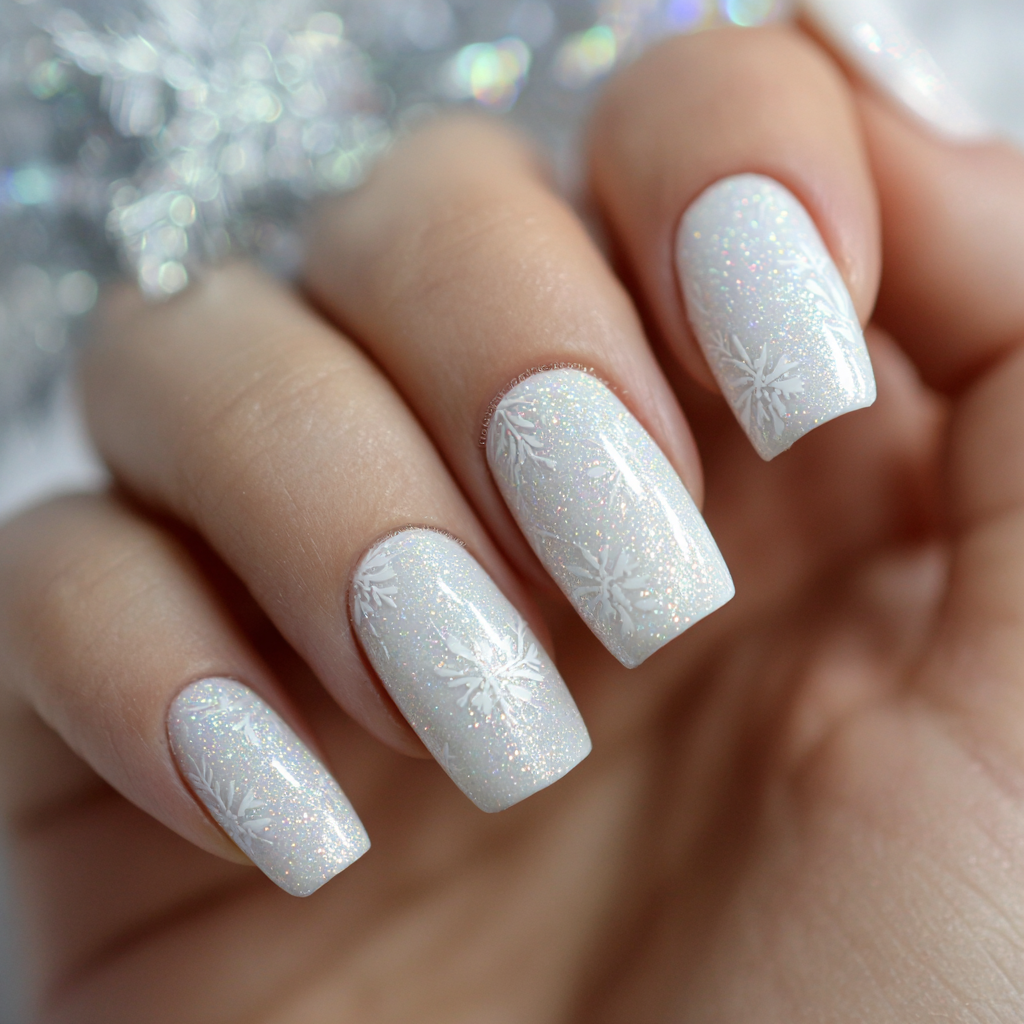 White polish with a pearly or frosted finish looks crisp, elegant, and wintery — ideal if your outfit leans neutral or metallic.