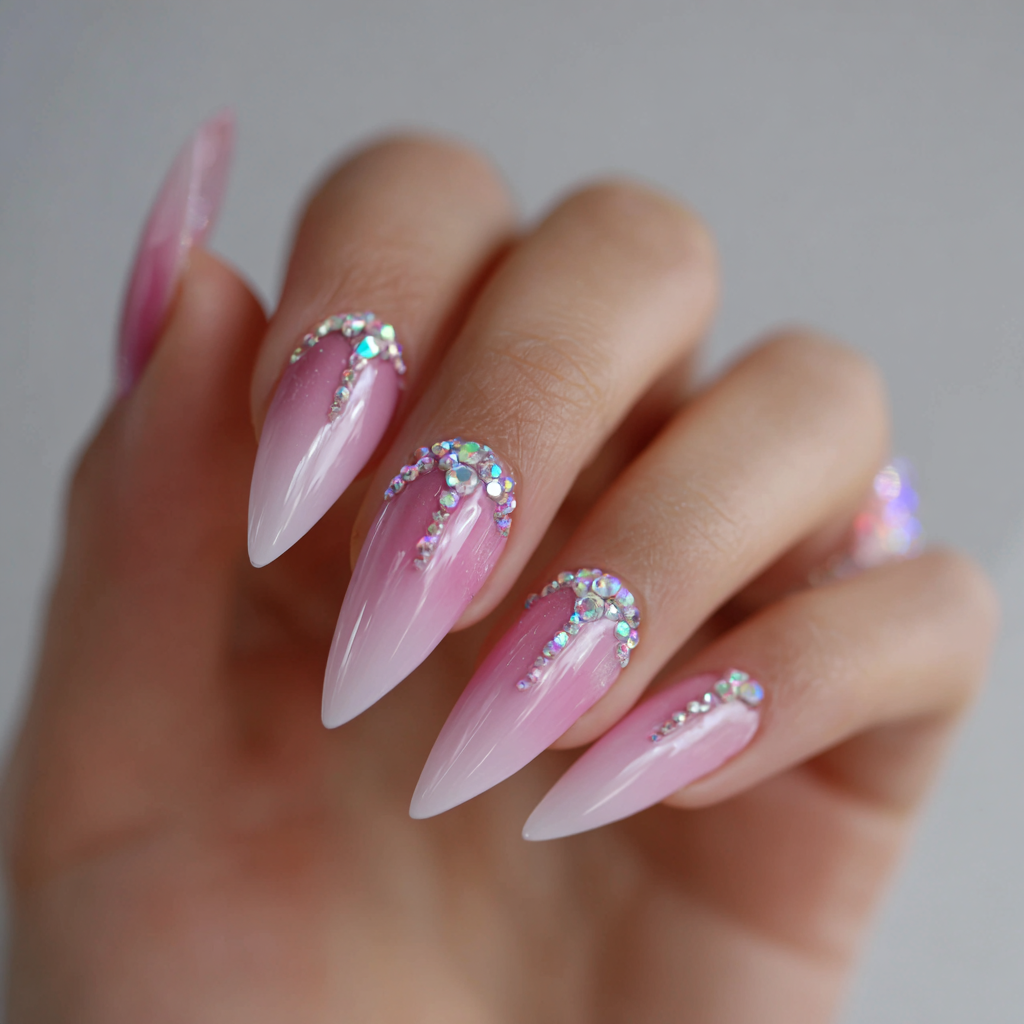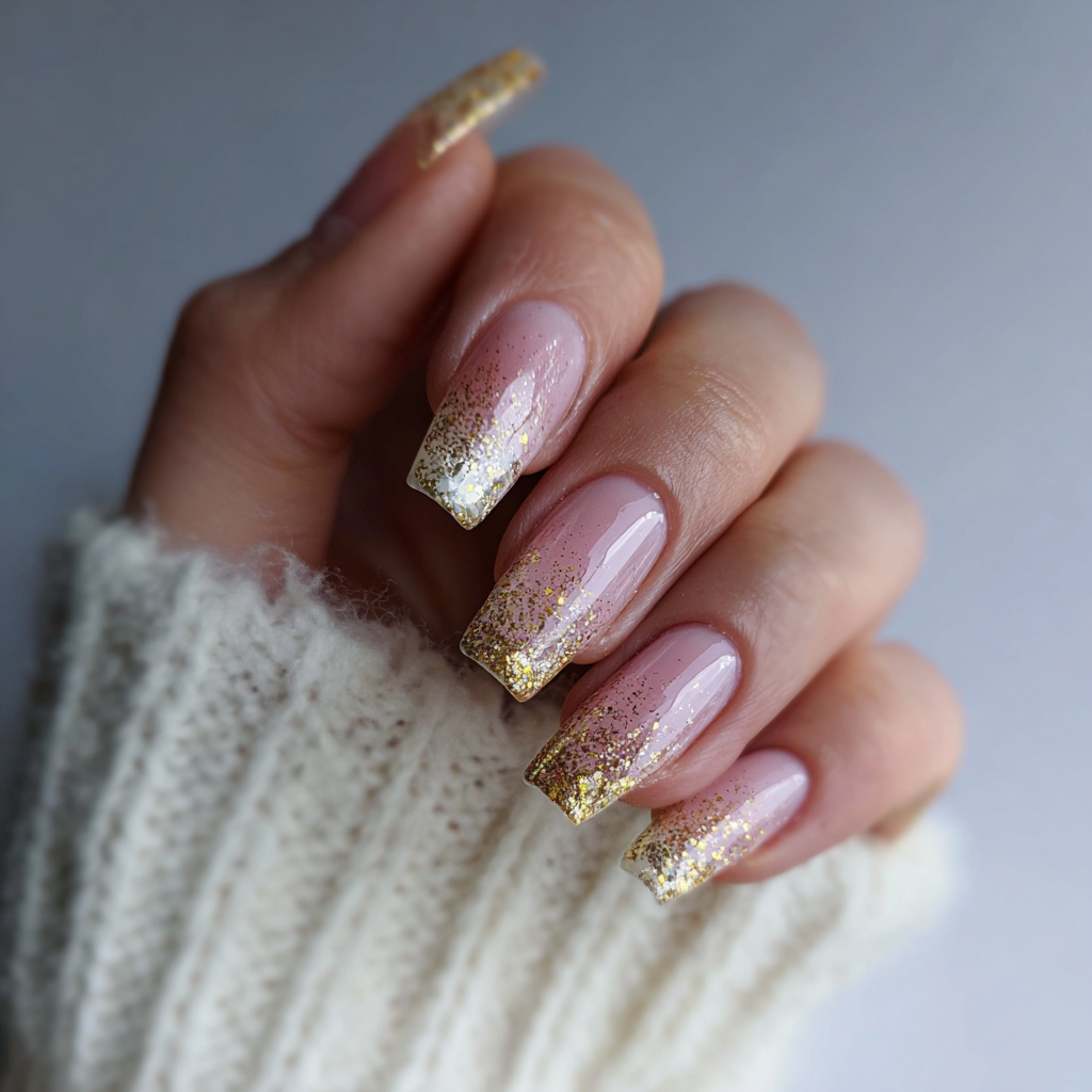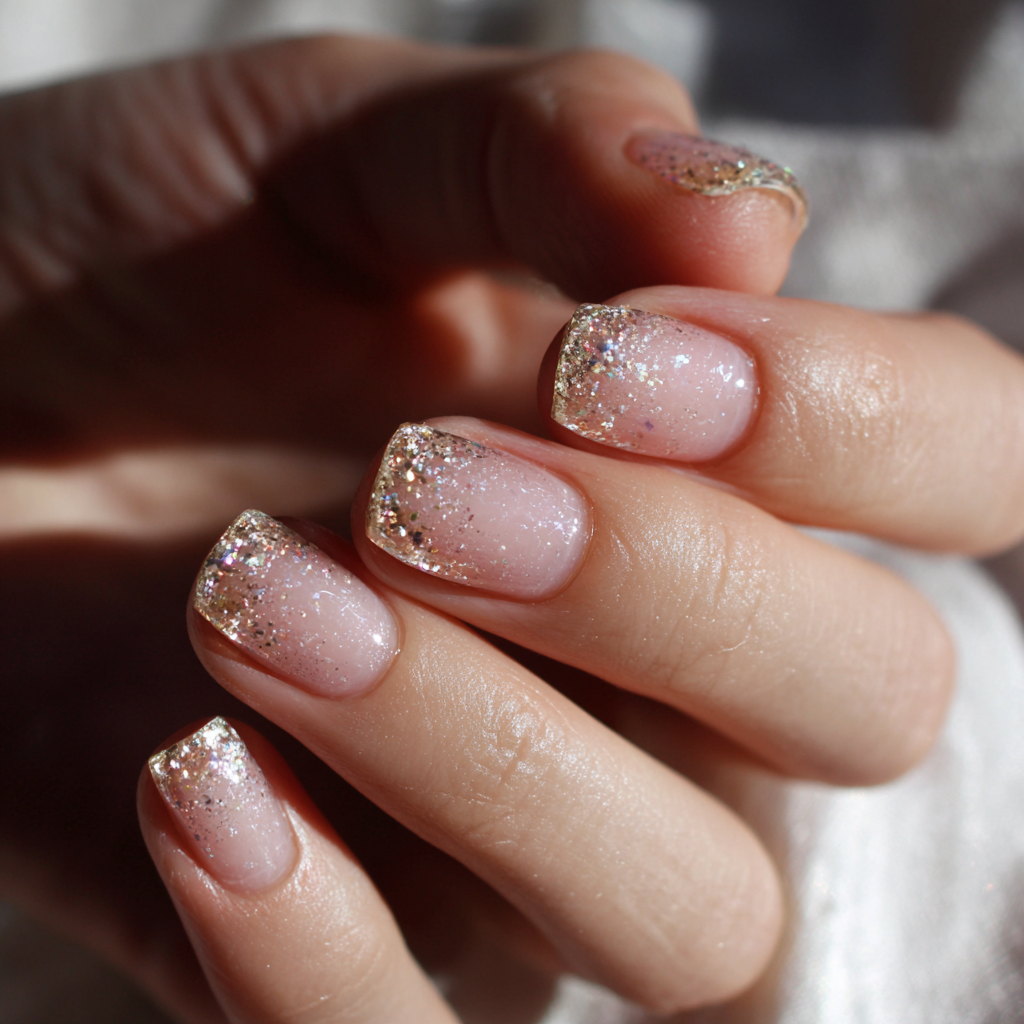 A light glitter gradient from the tips fading into a nude base — simple, sparkly, and perfect for champagne toasts at midnight.