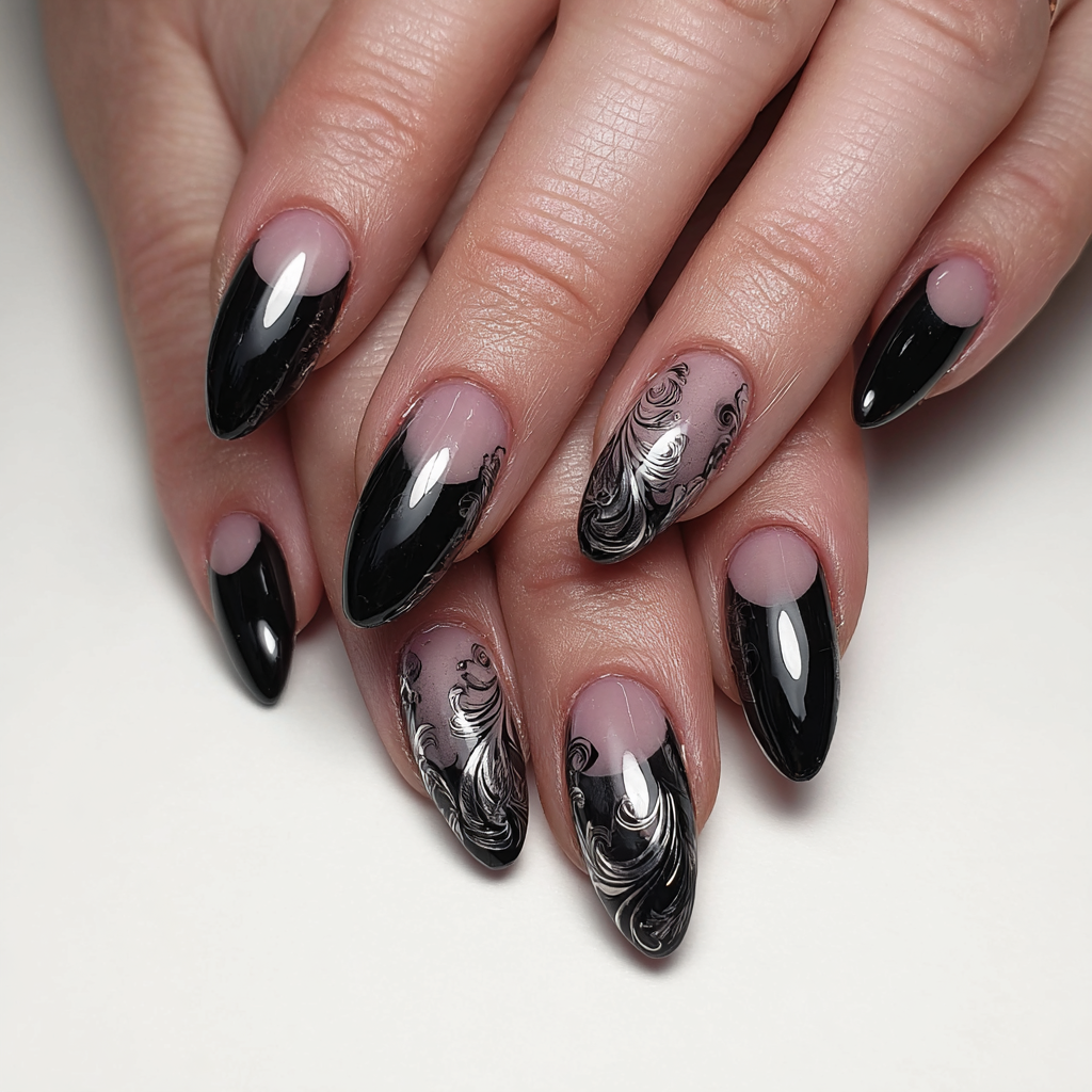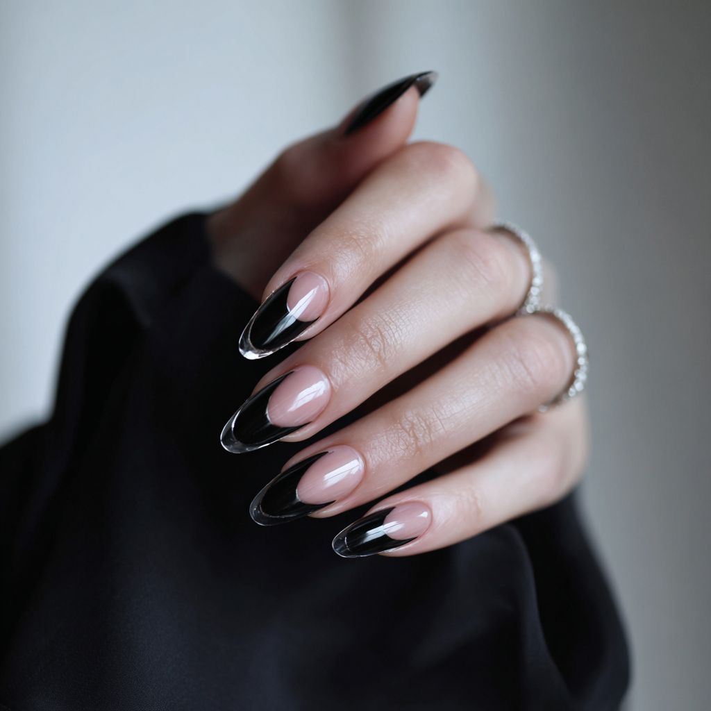 Flip the French! Paint your nail bed black and leave the tips sheer. It’s sleek, geometric, and gives that designer minimalism energy.