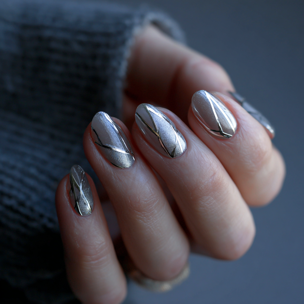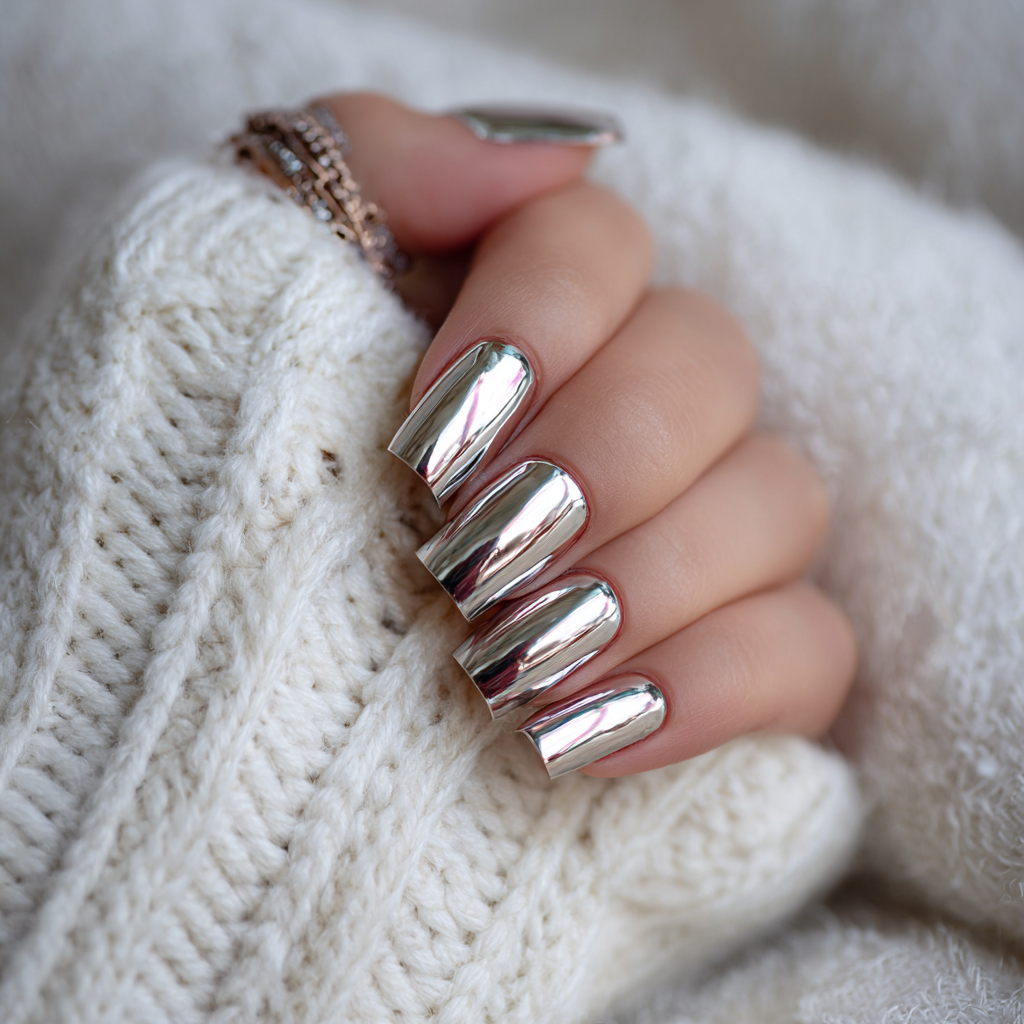 Keep most nails neutral or soft pink, and go full mirror-silver chrome on just one accent nail. It’s understated luxury at its best.