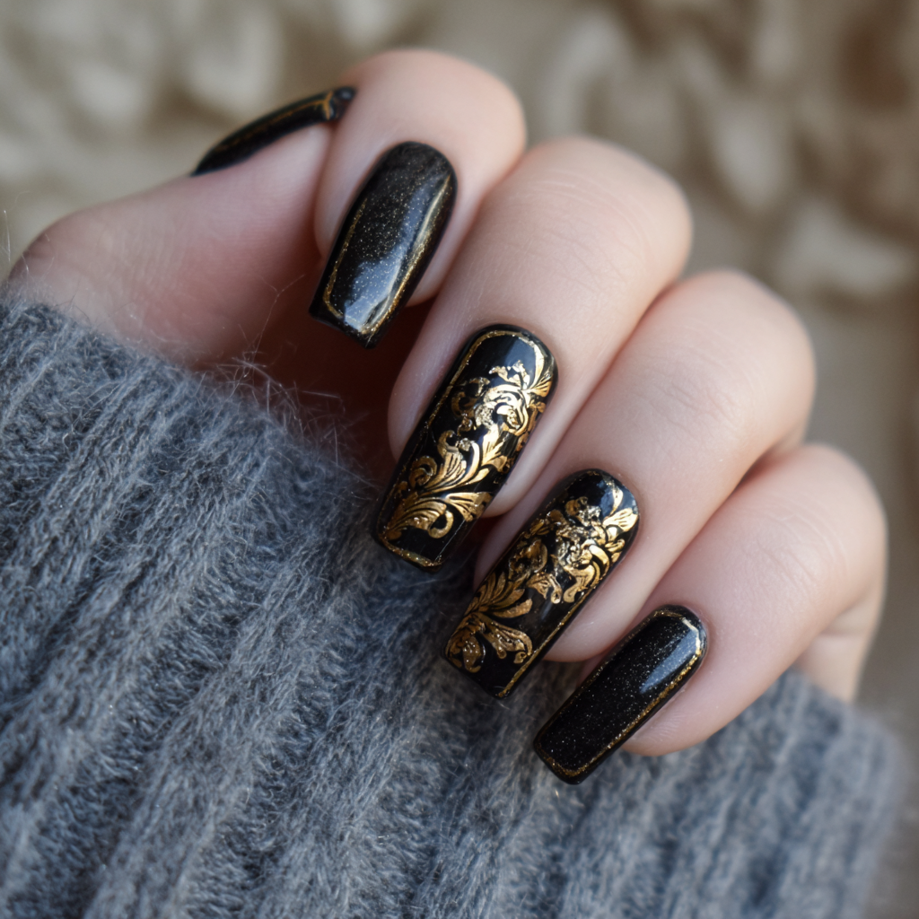 Paint your nails black and add a single gold accent nail (or gold stripe) for balance. It’s bold, clean, and gives off major midnight party energy.