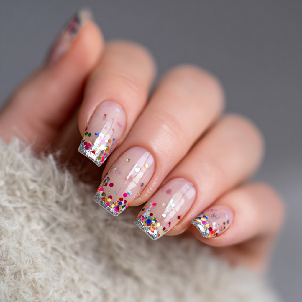Add a dusting of tiny silver flakes to the edges of your nails for an icy-glam look — like snow meets sparkle. ❄️