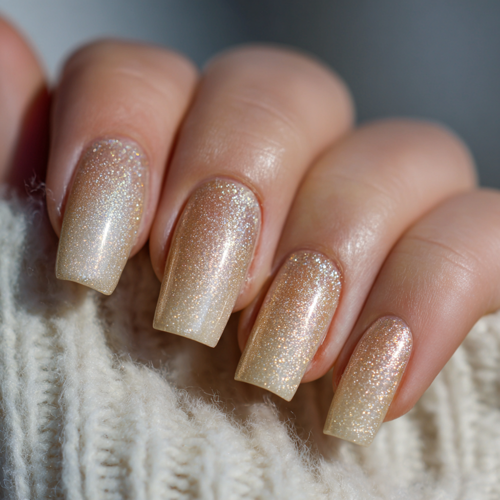 A soft, champagne-toned shimmer polish gives just enough glow to catch the light. It’s basically the nail version of your favorite bubbly. 🍾