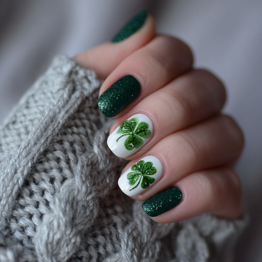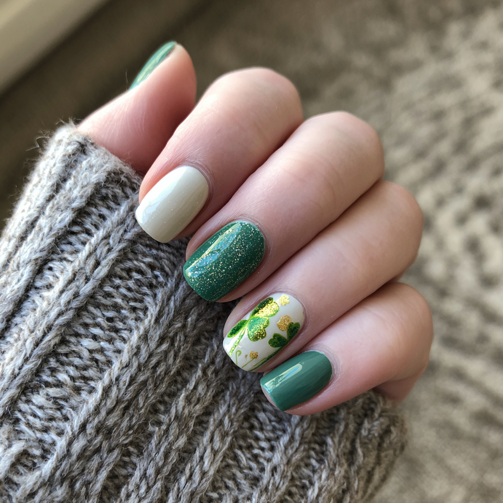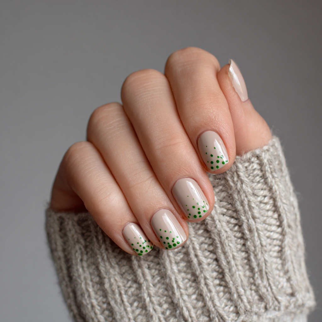 A nude base keeps the look clean and elegant. Add one tiny green detail—a dot, line, or micro clover—and suddenly it’s festive without being obvious.