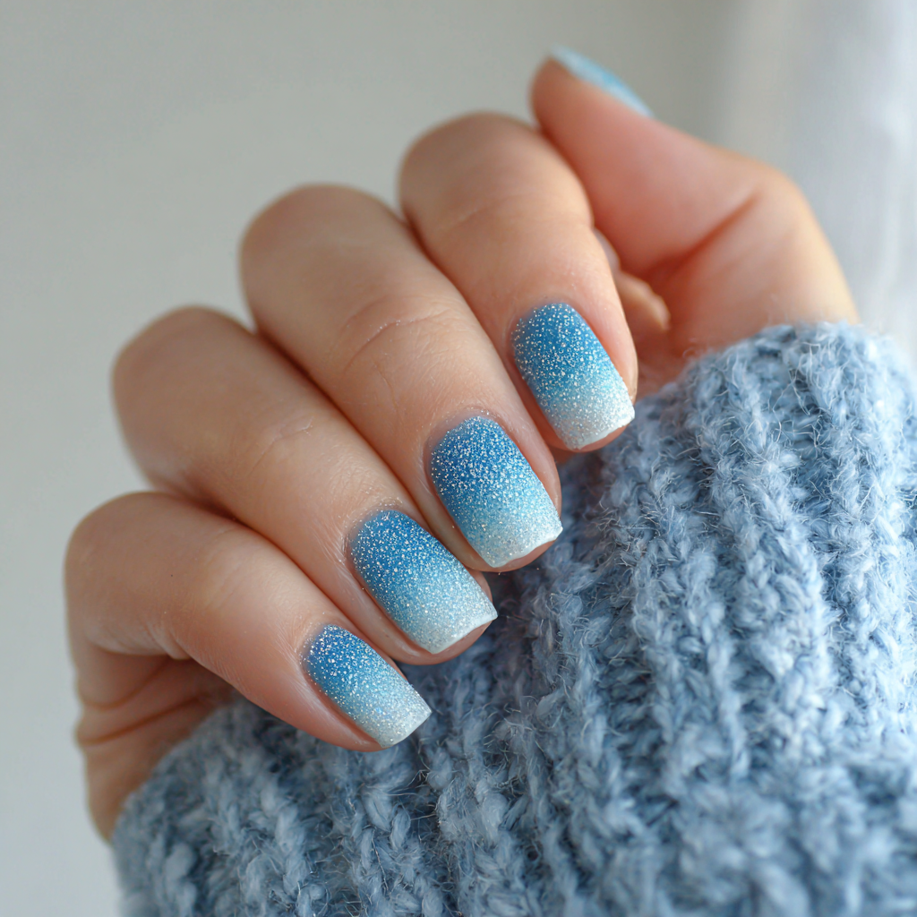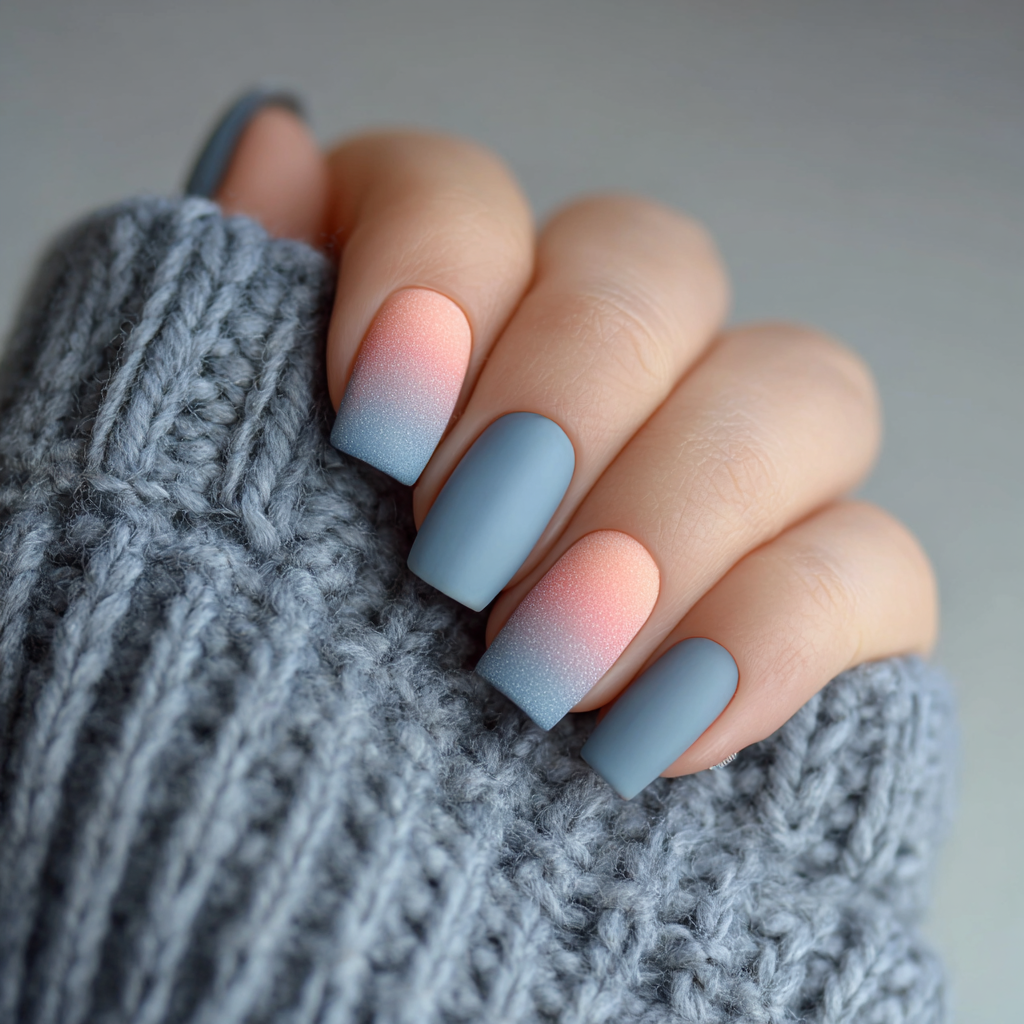 A soft matte or satin top coat turns a basic ombre into a winter statement. The colors still blend, but the finish feels icy and refined.