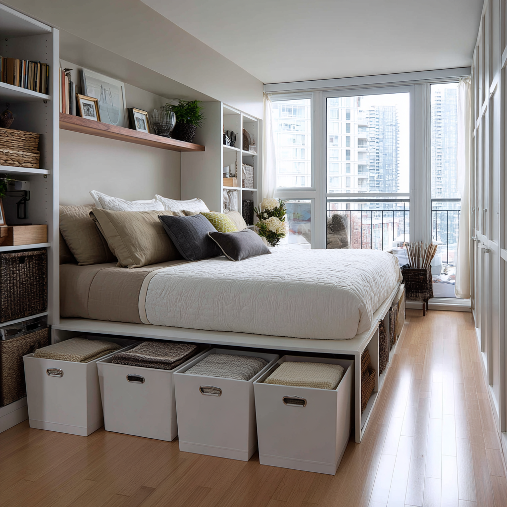 - Use rolling storage bins or get a bed frame with built-in drawers.
