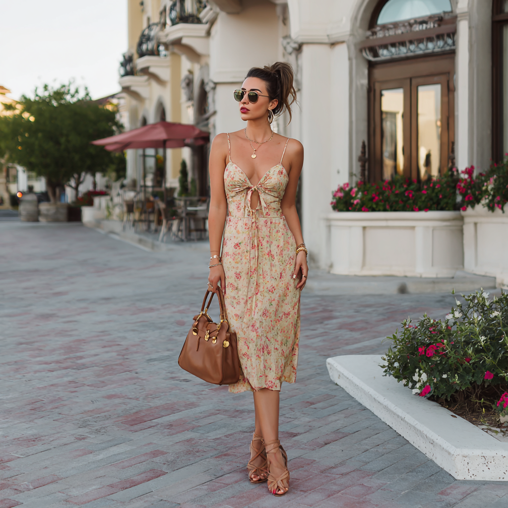 A floral midi dress in soft or muted tones feels feminine without being loud.