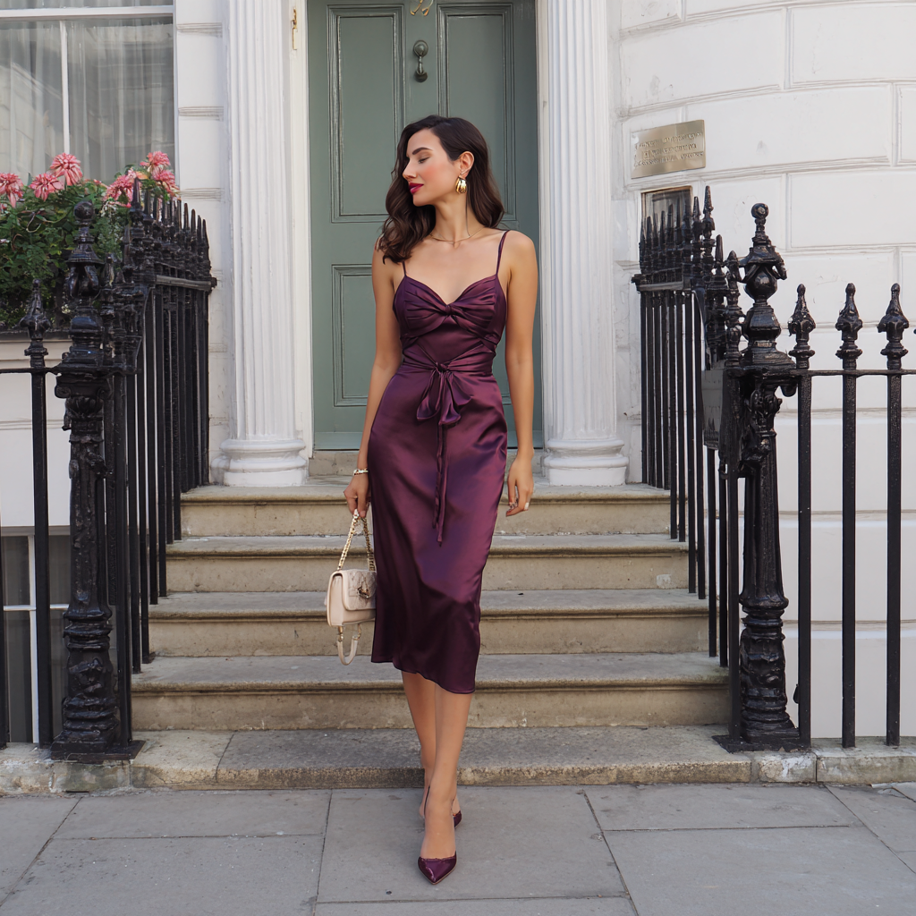 A satin midi dress reflects light beautifully and gives that soft glow effect at night.