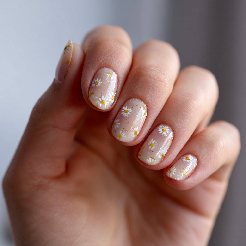 Think little white daisies on a nude base. It’s giving picnic-in-a-meadow energy, and I’m here for it.